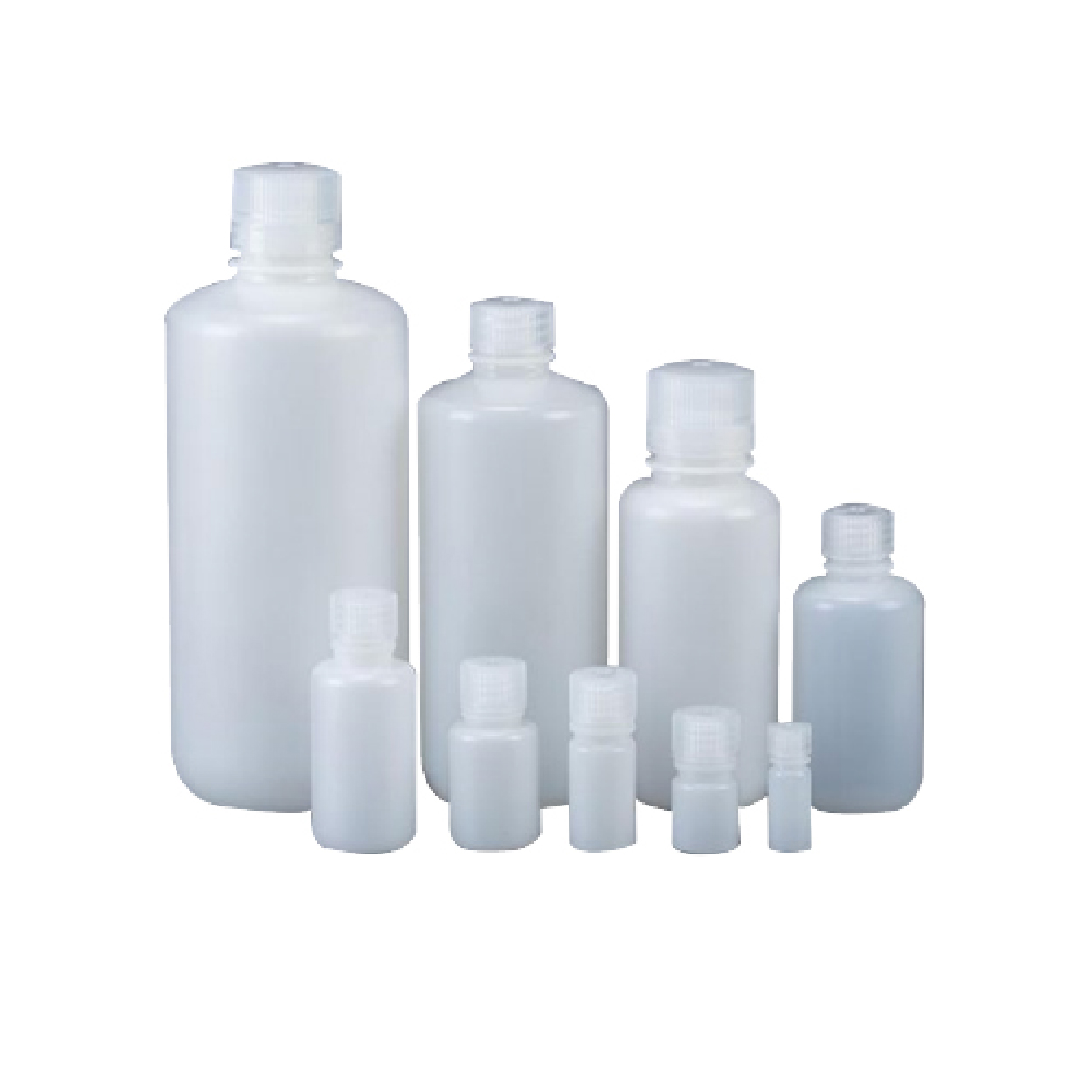 ขวดพลาสติกปากแคบสีขาวขุ่น พร้อมฝาปิดแบบเกลียวหมุน ยี่ห้อ BIOSCAN ผลิตจากวัสดุชนิด High Density Polyethylene (HDPE) เนื้อพลาสติกมีความหนาและแข็งทนทาน ไม่ยืดหยุ่น ป้องกันการแตกและการกระแทกได้ดี ทนต่อสารเคมีและป้องกันการระเหยของสารที่มีการระเหยได้ดี ใช้สำหรับเก็บของเหลว สารเคมีและอื่นๆ